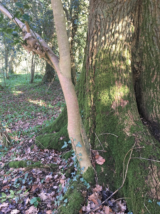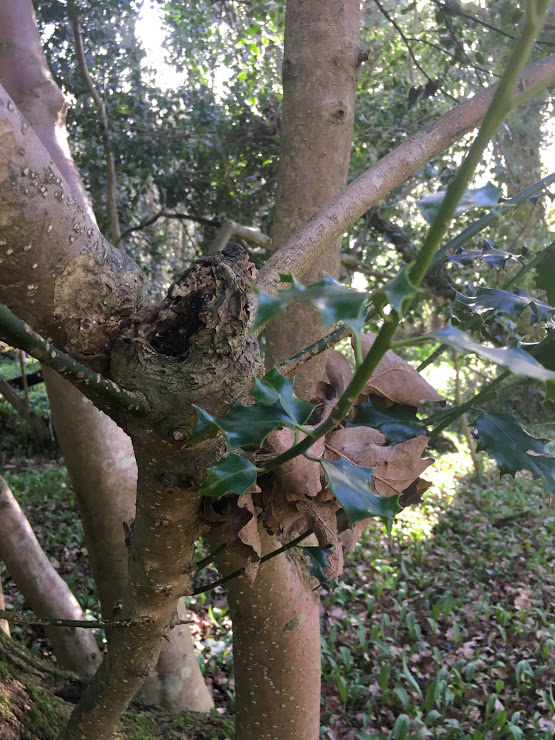 And I particularly enjoyed meeting a very old oak that has gotten very attached to some holly, sandwiching itself between and absorbing some within itself