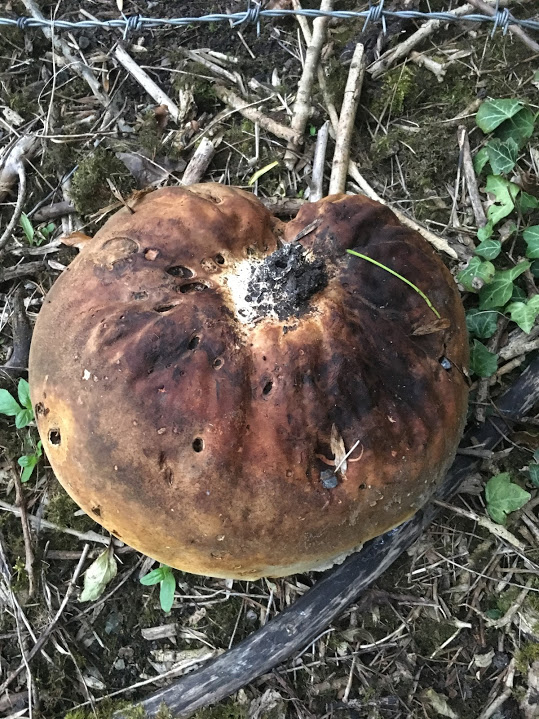 On a whim I drove down that way with my youngest, we have taken to going on short drives to see a bit of the lay of the land and speculate about what we would like in terms of houses or land or projects in the area if we won money or something. I heartily recommend random drives with teenagers by the way, I think there’s something about the proximity and the way they don’t have to look you in the eye that gets them to ask useful questions or get things off their chests. It started out well enough, we passed some people on bikes enjoying the evening. There was grass in the middle of the road.. it got taller… it became very intimate with the underside of the car indeed… we decided that we really should take the earliest opportunity to turn around and come back some other day without the car. Where we stopped to turn around was gorgeous, a veritable pool of good scented air, all honeysuckle and pine. We horsed around throwing pine cones at each other for a bit and then found the most enormous puffballs. I had remarked very recently that I hadn’t seen any very big puffballs in ages myself, and then there were many, in various stages of life.