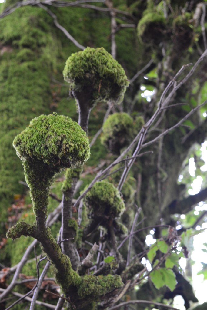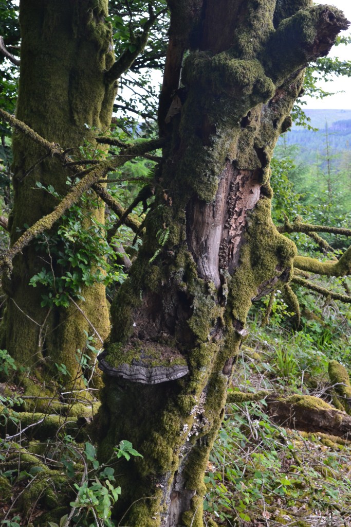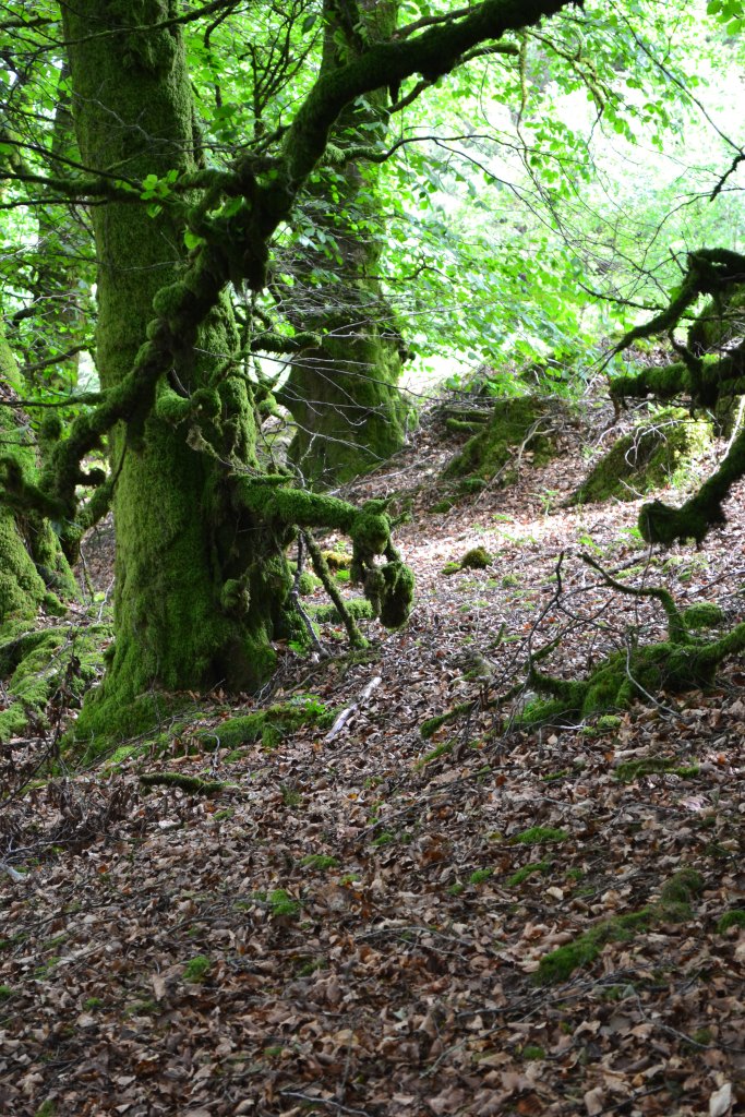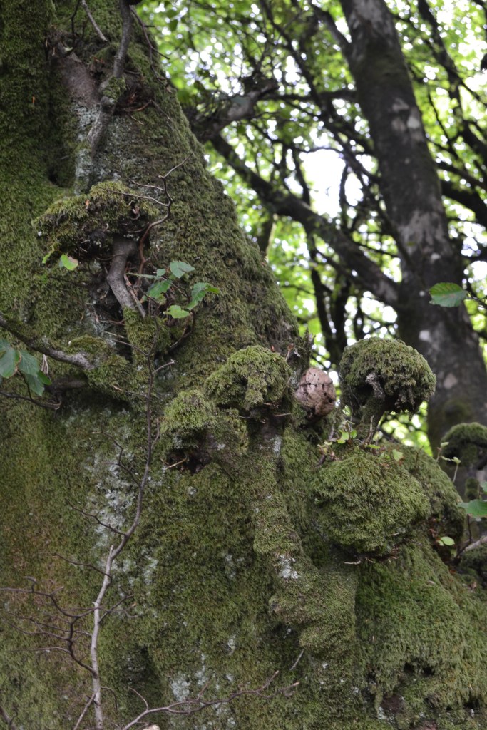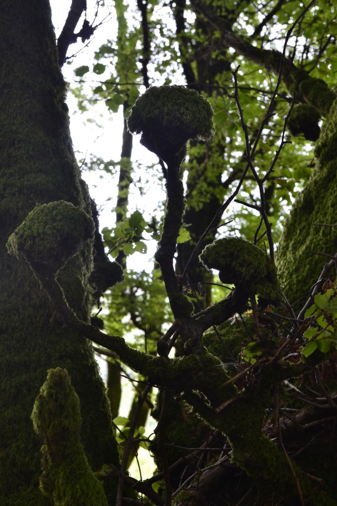Beyond the initial stand of smooth barked guards, however, the wood became a far more eldritch, scrambling, moss furred place, fallen trees and branches entangling and twining in a slow failing, downwards sinew towards light and the valley, home to creatures worthy of the Dark Crystal masquerading as moss.