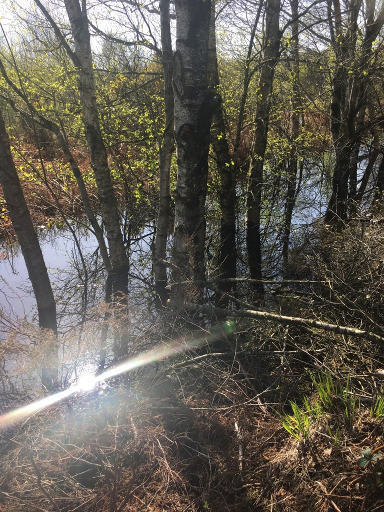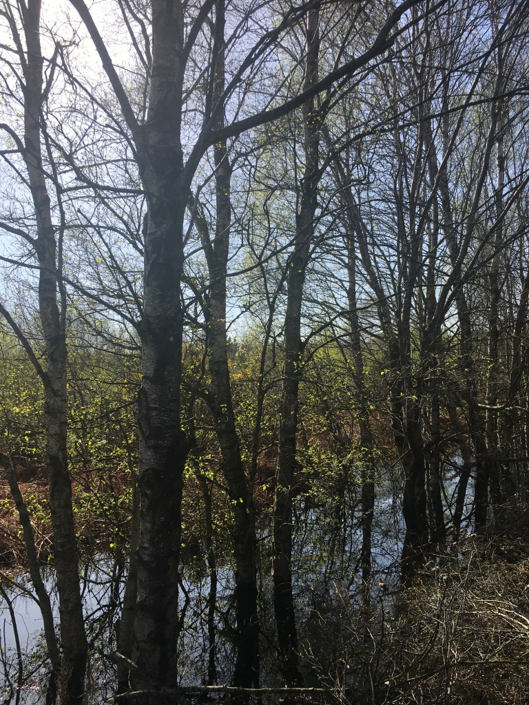 In The Songs of Trees (which I adore) at one point David Haskell notes that certain spaces are not as accessible to all in a way that is not immediately obvious to, for example, a reasonably well off white guy going about his daily life. I only bring this up because I thought long and hard about persuading my eldest son to go walking today with me, having had a bit of an attack of “you can’t go walking in an isolated area by yourself, especially now”. There are a huge variety of reasons for this thought pattern, including quite possibly an occasional overdose of American crime shows like Criminal Minds at an impressionable time, and I’m not going to start into any serious discussion about it right now. Today there were two reasons why I was glad I went anyway. Thing the first is the astonishing, multilayered physical sea of insect noise I waded through. He detests buzzes and whines, not having yet learned to distinguish various insect noises from that of wasps of which he is phobic. I remember working on the bog and being constantly anxious listening for the particular whine of horseflies, the bites of which I tend to react to in particularly extravagant fashion. I can’t say I was always especially comfortable today, insect whine still irritates me, but I found myself strangely pleased by the amount of it, having read so much in later years about Insectageddon. I understand that the reduction in traffic noise generally has meant that birdsong and presumably insect buzz is far more noticeable, but even so, it was like being in my teens again. I sat on my fallen birch trunk and soaked in sun watching more bee varieties than I ever knew existed get up to all manner of high jinks in their lives while the birds sang their hearts out doing whatever manner of swearing at each other, charming each other or being as downright suggestive as their little hearts felt like and it sounded just glorious. And so there was the second reason – I felt better than I have in ages, all on my own watching sunlight glint off water pools and little bursts of fresh green wave about on the budding trees while slowly Spring seeped into my bones once and for all and feels like a real thing this year at last.