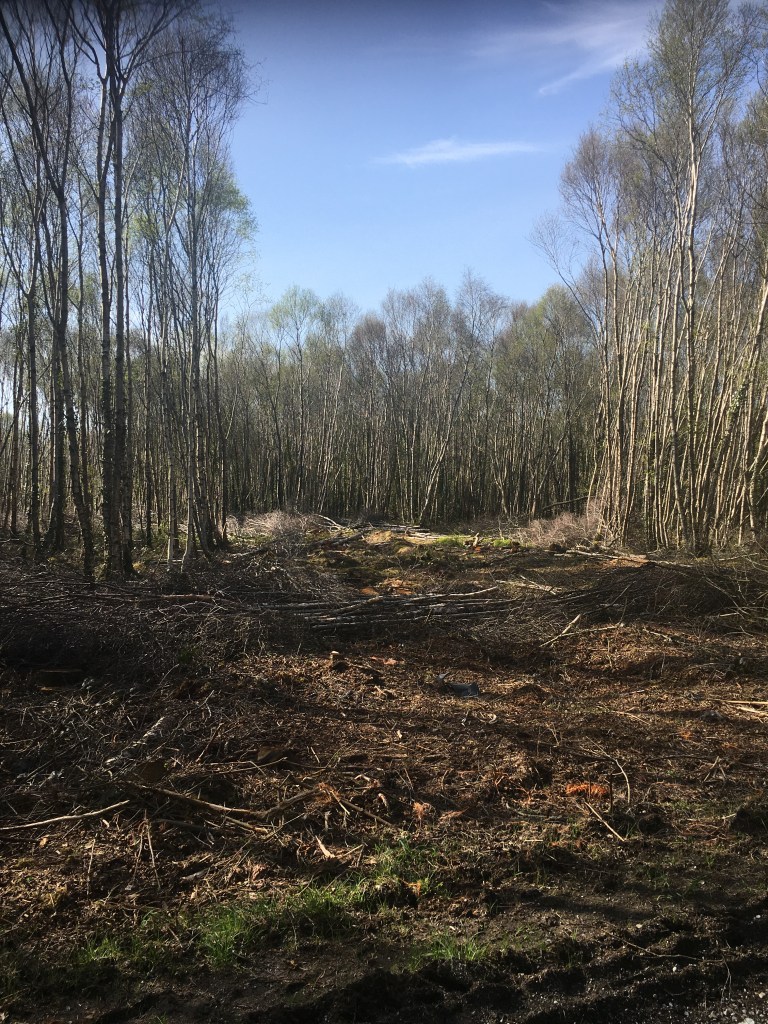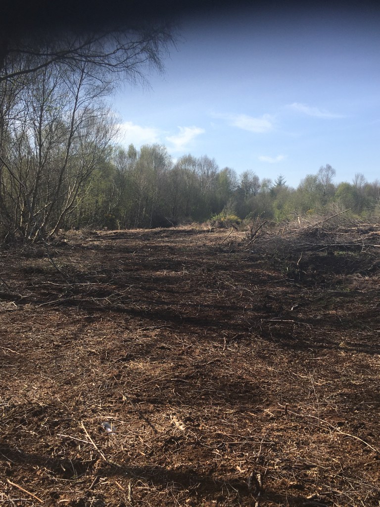 Today’s walk was a walk I don’t take very often, since I usually have access to bigger woods. I’m not complaining for a second, since I am utterly lucky to have access to any at all, and I have several spots along the path that are the equal of any good experience under sky I have ever had. I went with the promise of a kind of nest of birch and gorse on the edge of the bog in which there were butterflies in great numbers last Autumn. I was a little anxious when I got there first, there is a lot of evidence of some large machine having spent time ripping out a lot of scrub, gorse and birch wood, and of landwork on the bog. I really hate the shattered injuries of trees that have had one of those mechanical flails used to face them, gold inards sharded against the sky and limbs trailing back into the ditch. The exposed look is being softened by the budding branches left behind, but I still dislike the practice. There are the tracks of machines all over but once I started to poke around I found plenty to be pleased by though fewer butterflies than I was expecting. I think the work may be beneficial in the longer term, some drains seem to have been reworked and felled trees and branches seem likely to provide good and interesting habitats to any creature living in the little wood to the side.